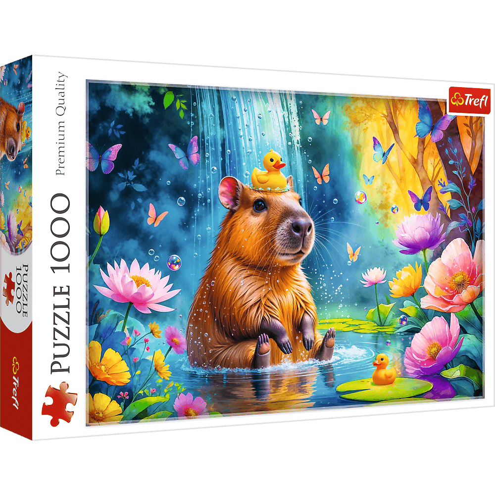 Puzzle Kapibara, składające się z 1000 elementów, przedstawiają zwierzątko na tle wodospadu. Po ich ułożeniu powstanie obrazek w rozmiarach 683x480 mm. Produkt wykonano w Polsce, przy użyciu wysokogatunkowych, ekologicznych materiałów. Specjalny kalandrowany papier odbija światło, co ułatwia układanie.