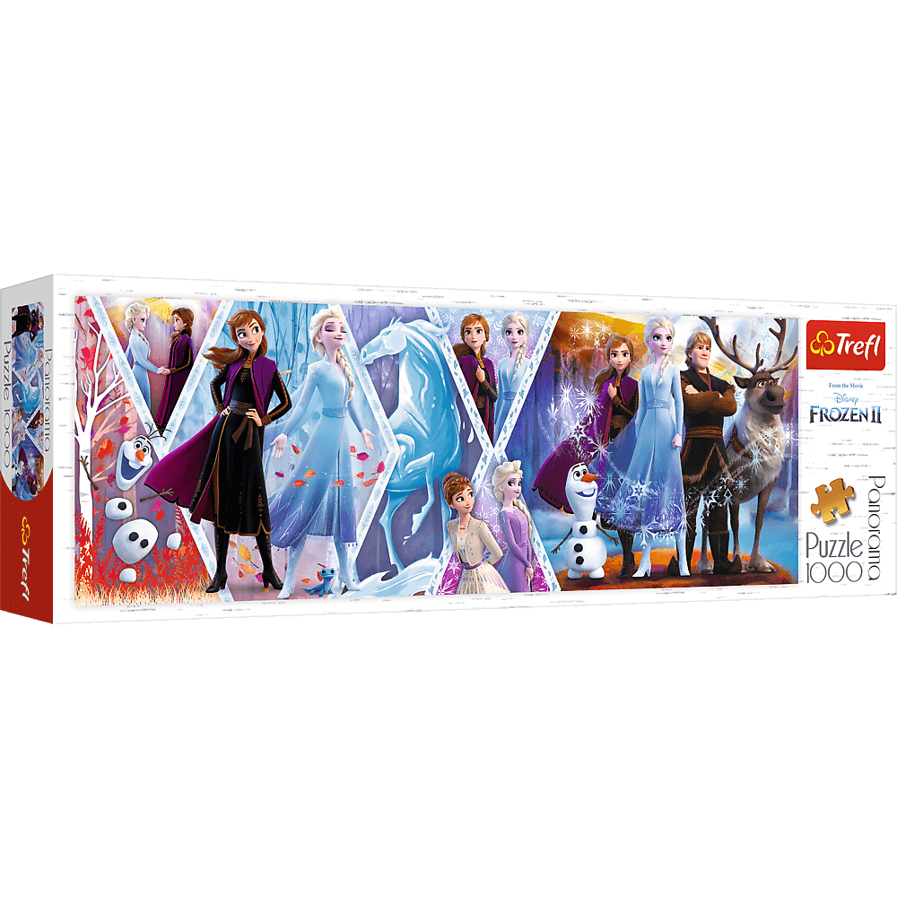 Puzzle panoramiczne składające się z 1000 elementów przedstawiające postacie filmu Kraina Lodu 2 (Frozen 2). Po ułożeniu powstanie obrazek o wymiarach 970x340mm. Produkt został wykonany z wysokiej jakości materiałów, z zastosowaniem specjalnego kalandrowanego papieru odbijającego światło, co ułatwia układanie.