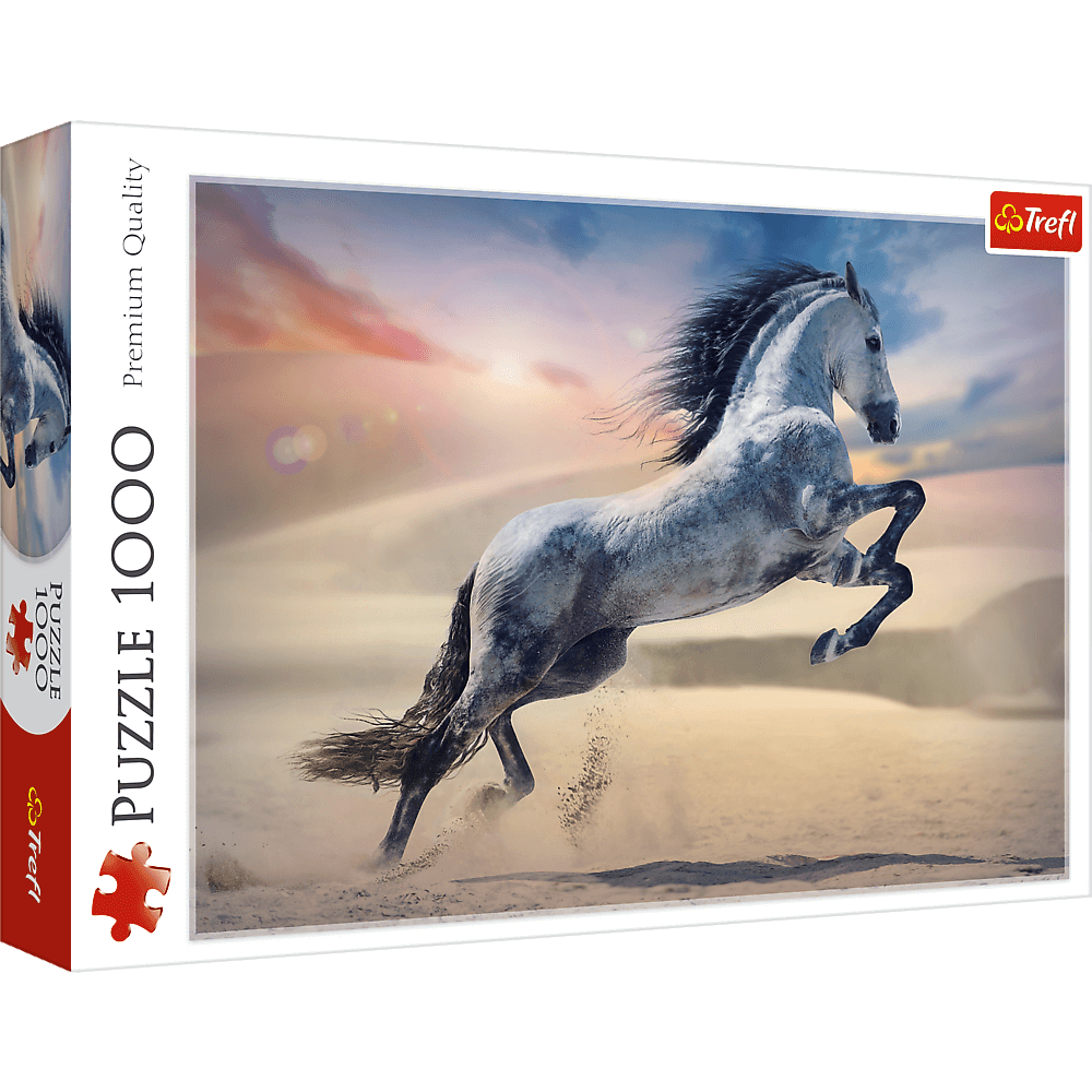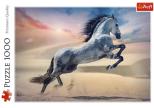 Puzzle Majestatyczny koń, składające się z 1000 elementów, przedstawiają biegnące po pustyni zwierzę, na tle zachodzącego słońca. Po ich ułożeniu powstanie obrazek o wymiarach 683x480 mm.