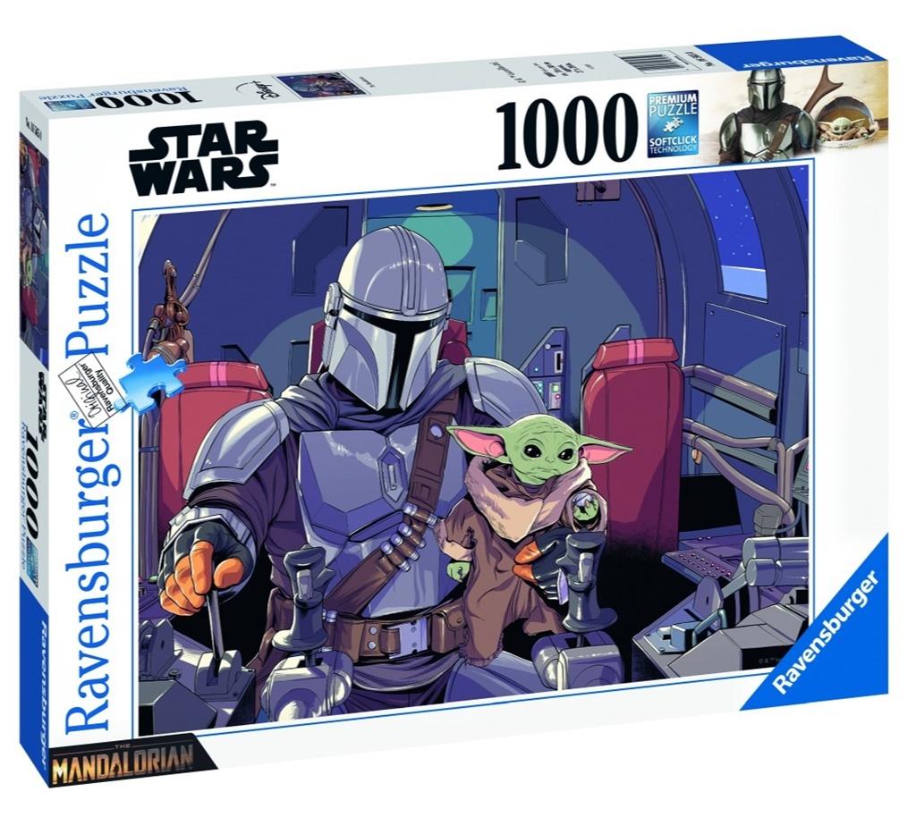 Seria puzzli 1000 elementów Ravensburger przedstawia unikalne i ciekawe do układania wzory, w tym przypadku układankę z motywem z serialu Mandalorian Gwiezdne Wojny.