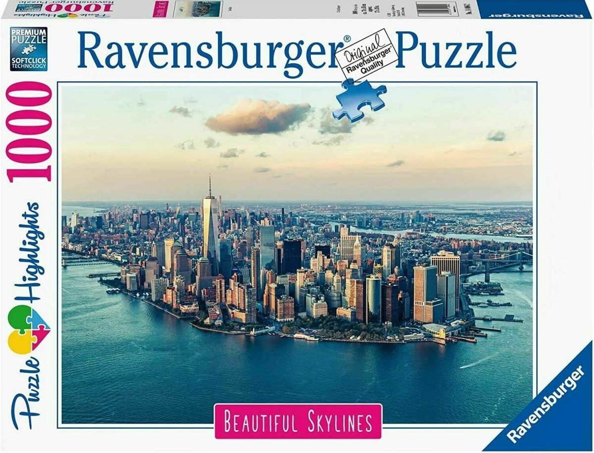 Seria puzzli 1000 elementów Ravensburger przedstawia wyjątkowe panoramy znanych miejsc, w tym przypadku widok na Nowy Jork. Po ułożeniu puzzle mają wymiary 70 x 50 cm.