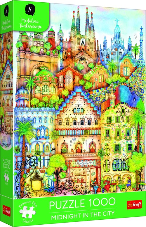 Puzzle Madalina Tantareanu: O północy w Barcelonie przedstawiają zabytki Hiszpanii, twórczości rumuńskiej artystki. Po ich ułożeniu powstanie obraz o wymiarach 683x480 mm..
