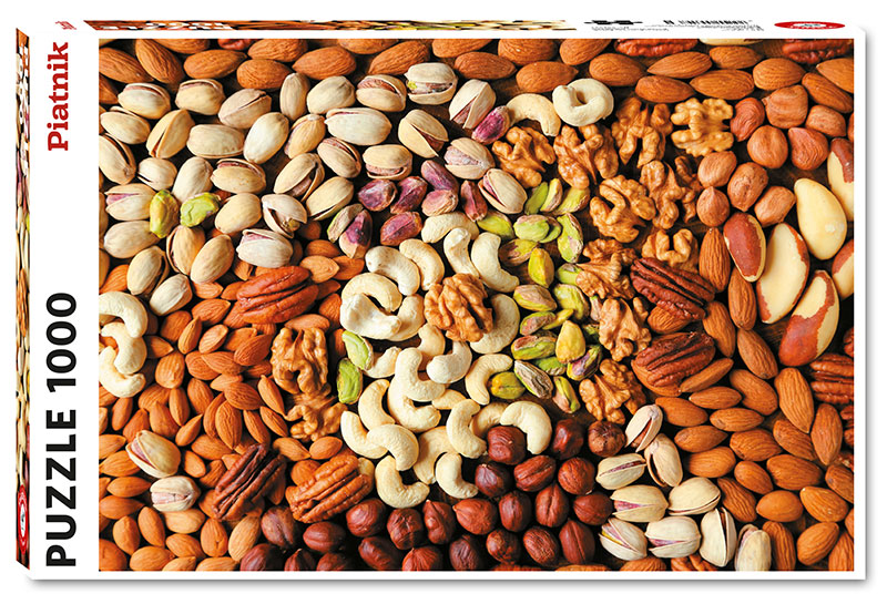 ielkość obrazu po ułożeniu: 67,5 x 44,1 cm. Układanie puzzli to twórcza rozrywka bez względu na wiek. Rozwija spostrzegawczość, uczy wytrwałości i ćwiczy koncentrację. Jest wyzwaniem, z którym można zmagać się w pojedynkę lub w większym gronie. Do ułożenia mamy obrazek, na którym znajdują się różnego rodzaju orzechy.