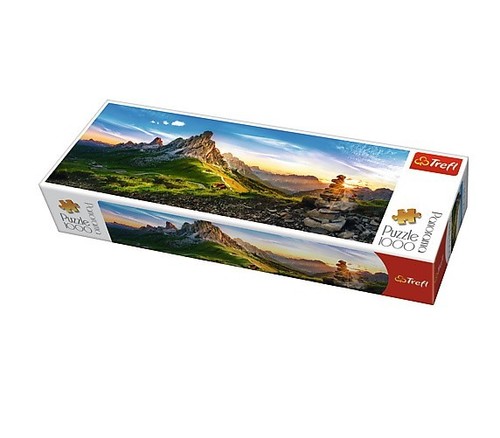 Panoramiczne puzzle 1000-elementowe ze zdjęciem wspaniałego widoku zachodu słońca w Dolomitach. Po ułożeniu powstanie obrazek o wymiarach 97x34 cm. Wysoką jakość, nasycenie kolorów i bezpieczeństwo układania zapewnia kalandrowany papier odbijający światło, pokryty ekologicznymi farbami spożywczymi.