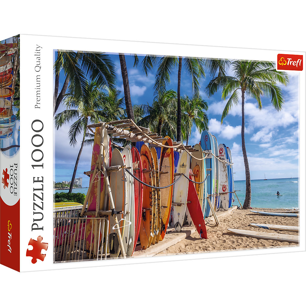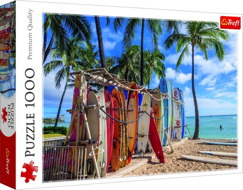 Puzzle składające się z 1000 elementów przedstawiające plażę Waikiki na Hawajach. Po ułożeniu powstanie obrazek o wymiarach 683x480 mm.