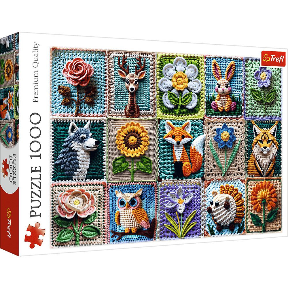 Puzzle Szydełkowanie - moja pasja, składające się z 1000 elementów, przedstawiają kolaż ze zwierzętami i kwiatami zrobionych metodą szydełkową. Po ich ułożeniu powstanie obrazek w rozmiarach 683x480 mm.