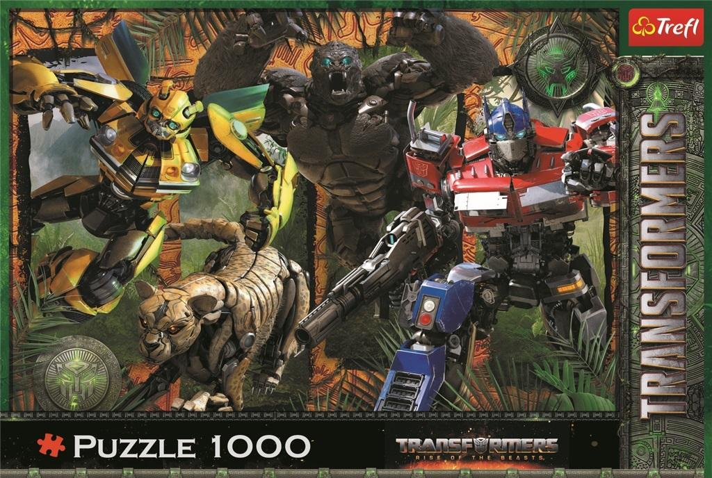 Puzzle 1000 elementów stworzone z myślą o fanach filmu Transformers: Przebudzenie bestii. Obrazek przedstawia różne postacie z filmu.