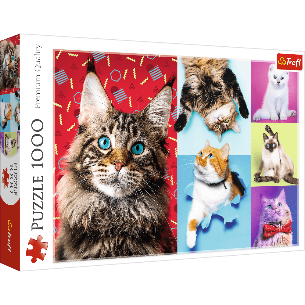 Puzzle ""Wesołe koty"" składające się z 1000 elementów przedstawiające kolaż zdjęć uroczych kotów, różnych ras. Po ułożeniu powstanie obrazek o wymiarach 683x480 mm. Produkt został wykonany z wysokiej jakości materiałów, z zastosowaniem specjalnego kalandrowanego papieru odbijającego światło, co ułatwia układanie. Produkt został wyprodukowany w Polsce, a do produkcji zostały użyte materiały ekologiczne.
