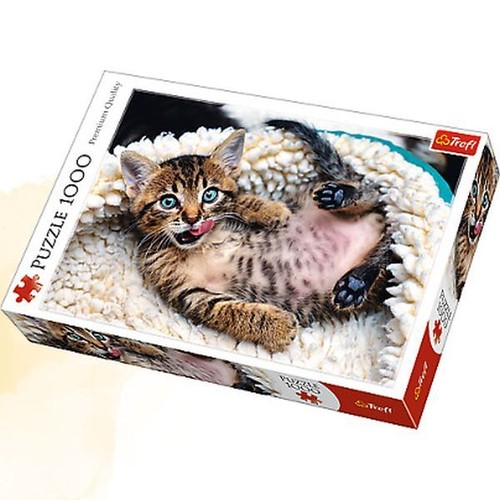 Puzzle 1000 elementów przedstawiające wesołego kotka. Po ułożeniu powstanie obrazek o wymiarach 68x48 cm. Wysoką jakość, nasycenie kolorów i bezpieczeństwo układania zapewnia kalandrowany papier odbijający światło, pokryty ekologicznymi farbami spożywczymi.