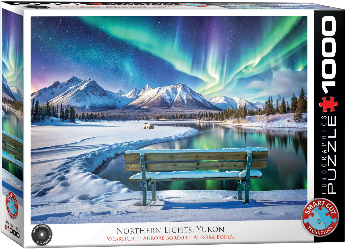 Wstęgi zieleni i fioletu rozciągają się przez rozgwieżdżone niebo Jukonu nad ośnieżonymi szczytami i lustrzaną, nieruchomą rzeką, a oszroniona ławka zaprasza do chwili relaksu.