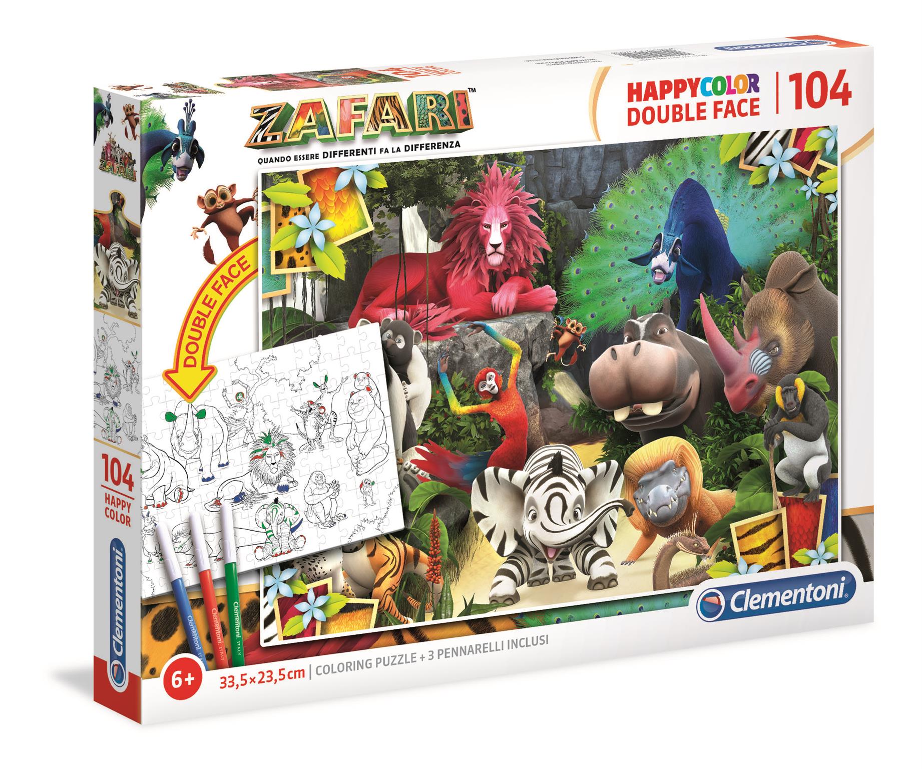 Wysokiej jakości Puzzle Happy Kolor Double Face Zafari cenionej marki Clementoni, składające się ze 104 elementów. Wymiary obrazka po ułożeniu 33,5x23,5 cm