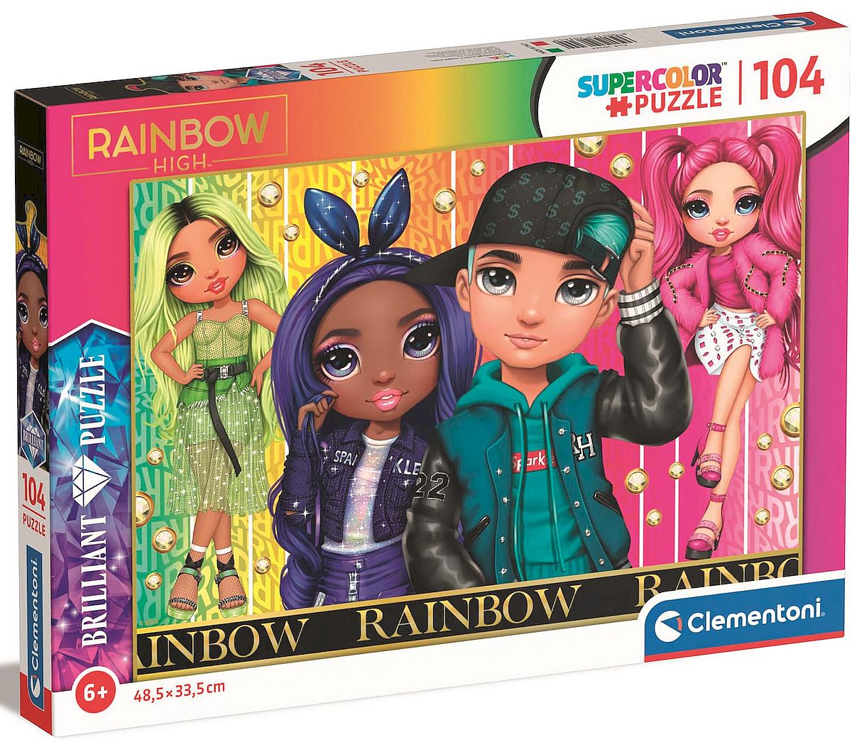 Puzzle Clementoni składające się z 104 elementów, motyw Rainbow High.