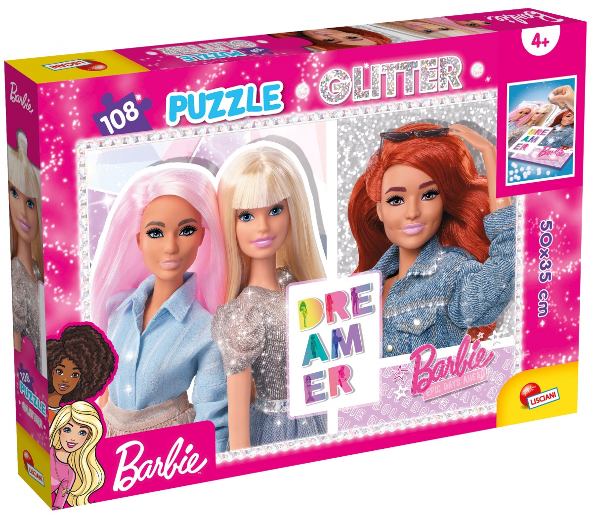 Wyjątkowe brokatowe puzzle na licencji Barbie. W zestawie znajduje się obrazek o wielkości 50x35cm, który składa się z 108 elementów.