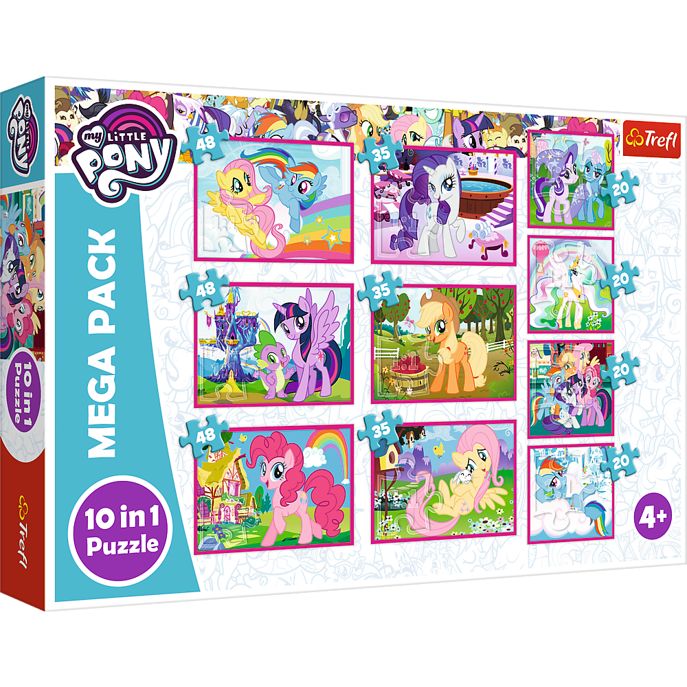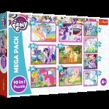 Mega zestaw puzzli 10w1 z motywem z bajki My Little Pony. Każdy obrazek składa się z wielu elementów od 20 do 48 puzzli.