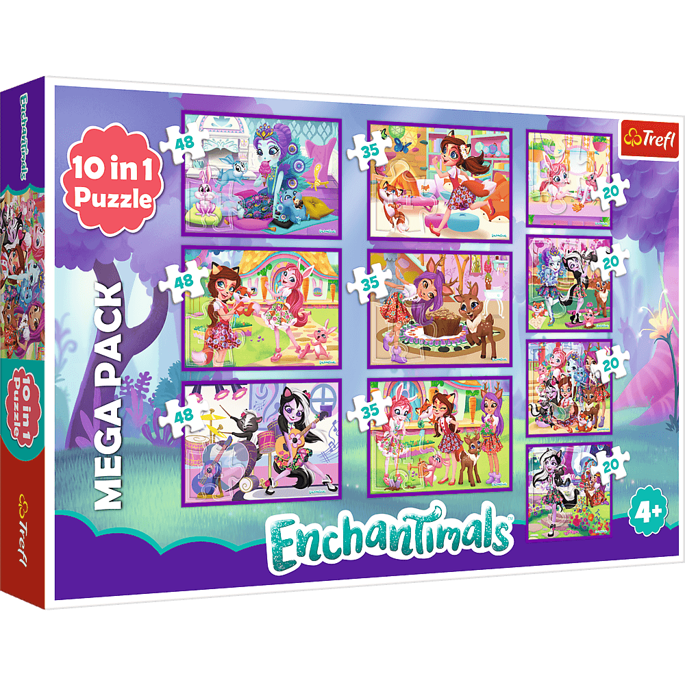 Zestaw Mega Pack składa się z 10 osobnych układanek o różnej ilości elementów i różnej wielkości ułożonego obrazku, przedstawiających fantastyczne przygody dziewcząt Enchantimals i ich leśnych przyjaciół.