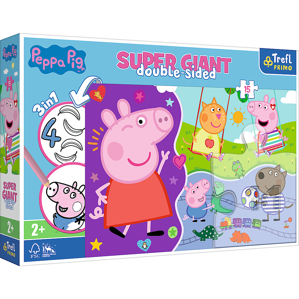 Poznaj wesołą Świnkę Peppę to aż trzy zabawy w jednym produkcie! Układanka z bardzo dużymi elementami sprawdzi się świetnie już od 2 roku życia.