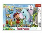Pomysłowe puzzle dla młodszych dzieci z wesołą grafiką. Układanka zawiera 15 elementów umieszczonych w ozdobnej, spójnej graficznie ramce, tworzącej z obrazkiem bardzo ładną całość. Dodatkowo ramka ułatwia młodszym dzieciom ułożenie obrazka i pozwala na bezpieczne przenoszenie układanki, dzięki czemu swobodnie ozdobimy nią pokój. Wyraziste kolory i prosty wzór są idealnie dostosowane do wieku i umiejętności dziecka. Wymiary obrazka - 26 x 16 cm. Wiek 3+