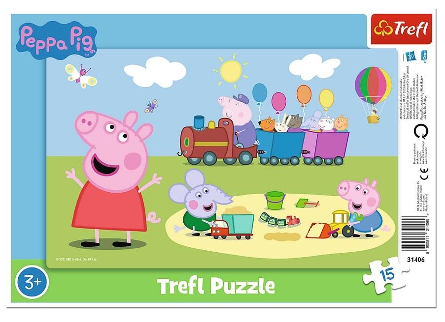 Puzzle w ramce składające się z 15 elementów, zaprojektowaną z myślą o wszystkich fanach i fankach Świnki Peppy. Po ułożeniu układanki powstanie obrazek o wymiarach 258x159 mm. Ramka, w której osadzone są puzzle, ułatwia młodszym dzieciom ułożenie obrazka i pozwala na bezpieczne przenoszenie układanki, dzięki czemu swobodnie ozdobimy nią pokój. Dla dzieci w wieku od 3 lat