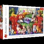 Puzzle składające się z 1500 elementów przedstawiające koty na kanapie. Po ułożeniu powstanie obrazek o wymiarach 85x58cm. Produkt został wykonany z wysokiej jakości materiałów, z zastosowaniem specjalnego kalandrowanego papieru odbijającego światło, co ułatwia układanie. Produkt został wyprodukowany w Polsce, a do produkcji zostały użyte materiały ekologiczne.