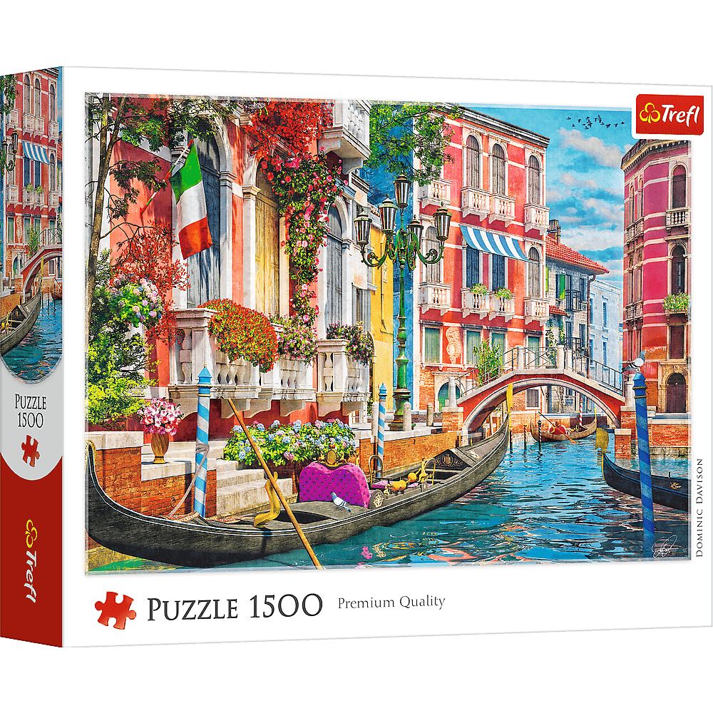 Puzzle Letnie popołudnie w Wenecji składają się z 1500 elementów i przedstawiają słoneczną, pełną kolorów wenecką uliczkę nad kanałem, z gondolami, kwitnącymi roślinami i eleganckimi kamienicami odbijającymi się w spokojnej wodzie. Po ich ułożeniu powstanie obrazek o wymiarach 850x580 mm.