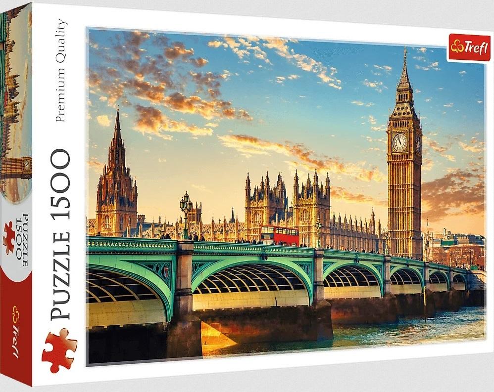Puzzle 1500 elementów przedstawiające Londyn. Po ułożeniu powstanie obrazek o wymiarach 85 x 58 cm.