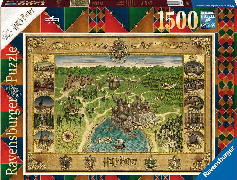 Puzzle 1500 elementów Ravensburger z postaciami z filmu Harry Potter to unikalna układanka przedstawiająca mapę Hogwartu.