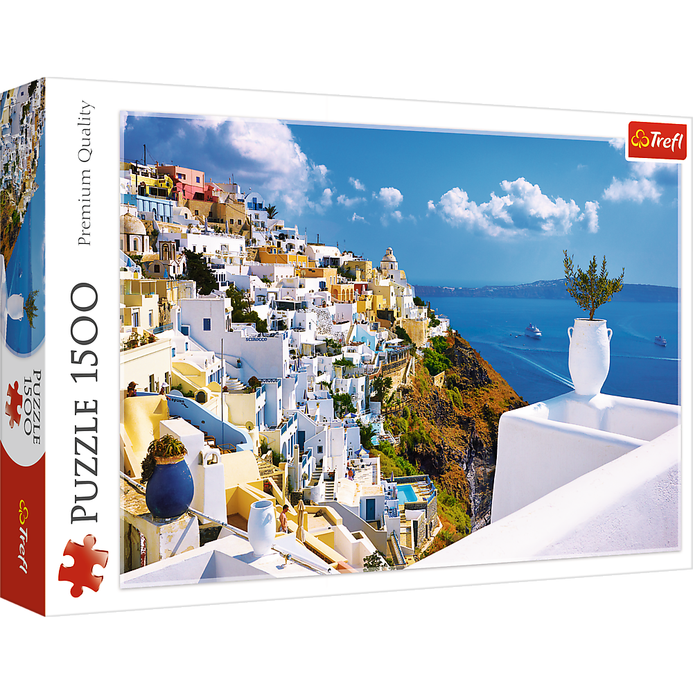 Santorini, Grecja Puzzle 1500 elementów z widokiem na greckie Santorini. Po ułożeniu powstanie obrazek o wymiarach 85x58cm. Wysoką jakość, nasycenie kolorów i bezpieczeństwo układania zapewnia wykorzystanie materiałów ekologicznych.