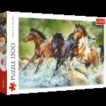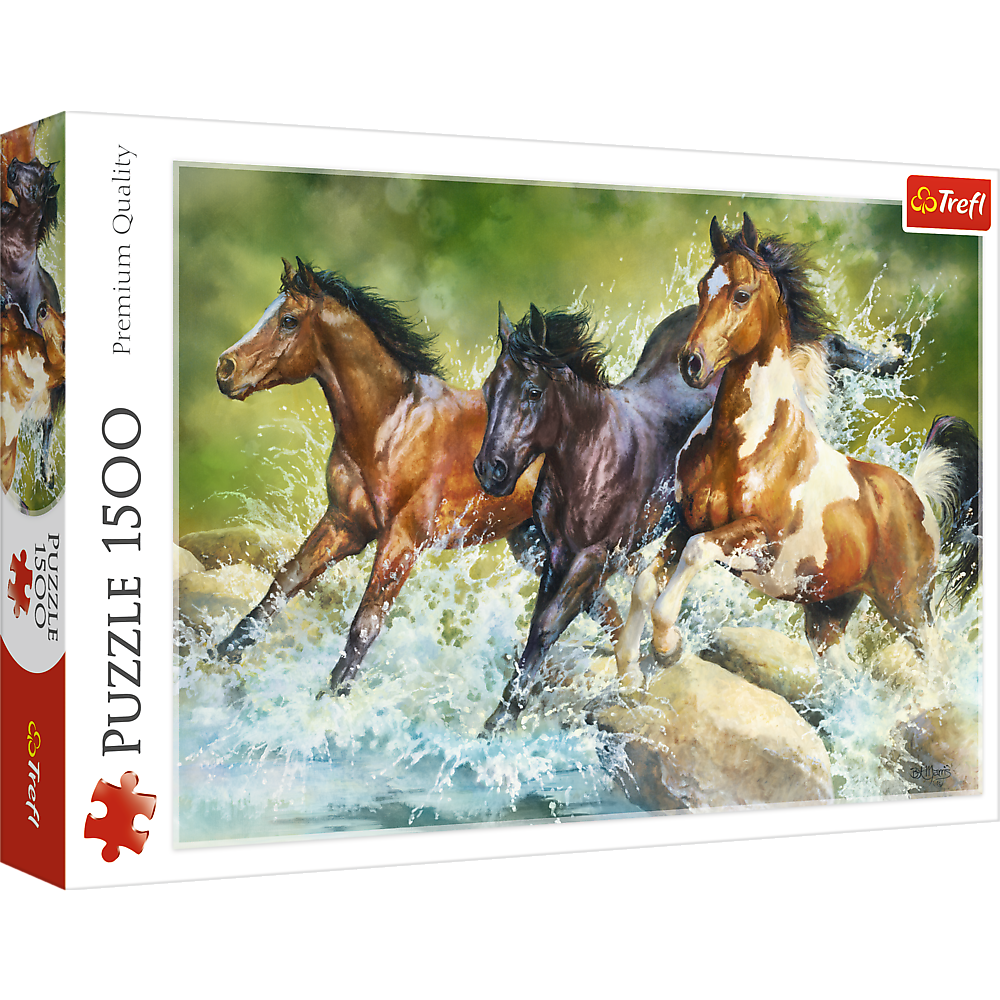 Puzzle 1500 elementów z przedstawiające trzy piękne konie w galopie. Po ułożeniu powstanie obrazek o wymiarach 850 x 580 mm. Wysoką jakość, nasycenie kolorów i bezpieczeństwo układania zapewnia wykorzystanie materiałów ekologicznych.