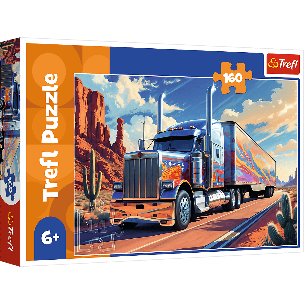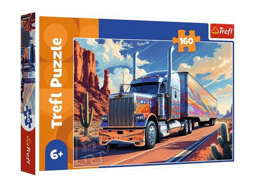 Ciężarówka w trasie to puzzle składające się ze 160 elementów, które zachwycą małych fanów motoryzacji. Po ich ułożeniu powstanie obrazek o wymiarach 410x275 mm, przedstawiający kolorową ciężarówkę na tle kanionu. Wysoką jakość, nasycenie kolorów i bezpieczeństwo układania zapewnia kalandrowany papier odbijający światło i wykorzystanie materiałów ekologicznych. Dla dzieci w wieku od 6 lat
