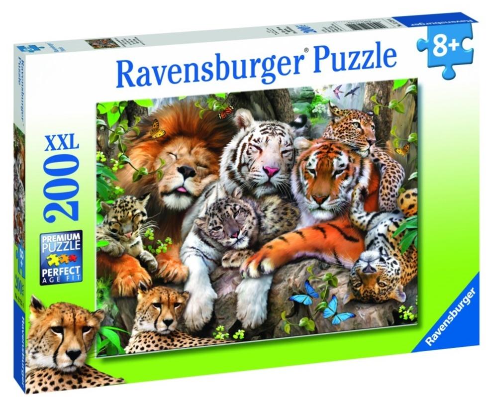 Puzzle XXL 200 elementów Ravensburger to składająca się ze 200 elementów układanka przedstawiająca tygrysy