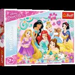 "Radosny świt księżniczek" to puzzle składające się z 200 elementów z bohaterkami bajek Disney. Po ułożeniu powstanie obrazek o wymiarach 48x34 cm. Wysoką jakość, nasycenie kolorów i bezpieczeństwo układania zapewnia kalandrowany papier odbijający światło i wykorzystanie materiałów ekologicznych. Wiek: 7+