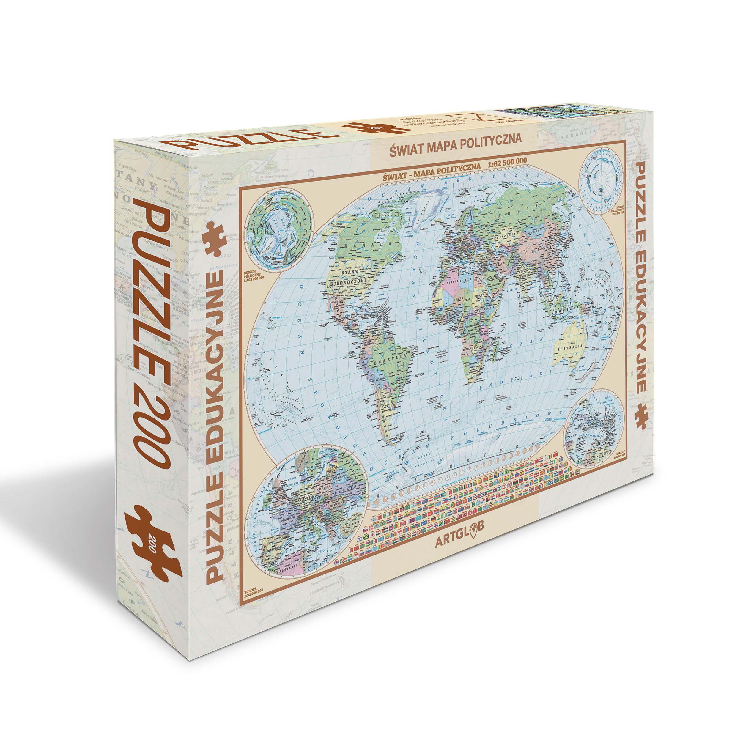 Mapa Polityczna Świata - Puzzle 200 Elementów Opis Produktu: Chcesz, aby Twoje dziecko lepiej poznało świat i jednocześnie świetnie się bawiło? Puzzle z mapą polityczną świata to idealne rozwiązanie! Te puzzle są doskonałe dla dzieci, które dopiero zaczynają swoją przygodę z układankami. Duże elementy i wyraźne detale sprawiają, że układanie jest proste i przyjemne. Znajomość mapy politycznej świata przyda się w szkole i może rozbudzić pasję odkrywania w małym podróżniku. Dlaczego Warto Wybrać Motyw Mapy Politycznej Świata? Puzzle z mapą polityczną świata to idealny start dla młodych odkrywców. Zamiast skomplikowanej topografii, dziecko może nauczyć się, gdzie leżą poszczególne państwa, miasta i stolice. Czytelne kontury i zaznaczone flagi państw sprawiają, że nauka staje się przyjemnością. Po ułożeniu, puzzle mogą służyć jako pomoc naukowa i dekoracja pokoju dziecka, zwłaszcza w antyramie. Specyfikacja Mapy Politycznej na Puzzlach Puzzle dla dzieci z mapą polityczną świata są wykonane w skali 1:62 500 000. Po złożeniu układanka osiąga wymiary 54 cm na 38 cm. Co Wyróżnia Nasze Puzzle? W ArtGlob stawiamy na najwyższą jakość. Nasze puzzle są wykonane z wytrzymałego kartonu, co zapewnia trwałość nawet przy wielokrotnym składaniu. Precyzyjny druk odwzorowuje detale i kolory z niezwykłą dokładnością, a idealne dopasowanie elementów eliminuje luzy i szczeliny. Starannie odwzorowane szczegóły na mapie politycznej świata zachwycą każdego. Solidne i estetyczne opakowanie dopełnia całość, oferując również czytelne instrukcje i praktyczne dodatki. Dlaczego Dzieci Powinny Układać Puzzle? Układanie puzzli przynosi dzieciom wiele korzyści. Rozwija umiejętności poznawcze, takie jak rozpoznawanie kształtów, kolorów i wzorców, co wspomaga pamięć i zdolności analityczne. Puzzle uczą cierpliwości, wytrwałości i systematyczności. Wspólne układanie wzmacnia więzi rodzinne i uczy współpracy. Puzzle to również doskonała forma relaksu, pozwalająca dziecku wyciszyć umysł i odprężyć się po dniu pełnym wrażeń. Układanki to spokojna i angażująca forma rozrywki, która przynosi radość zarówno dzieciom, jak i dorosłym. W Pudełku Znajdziesz: 200 puzzli składających się na układankę Mapa Polityczna Świata.