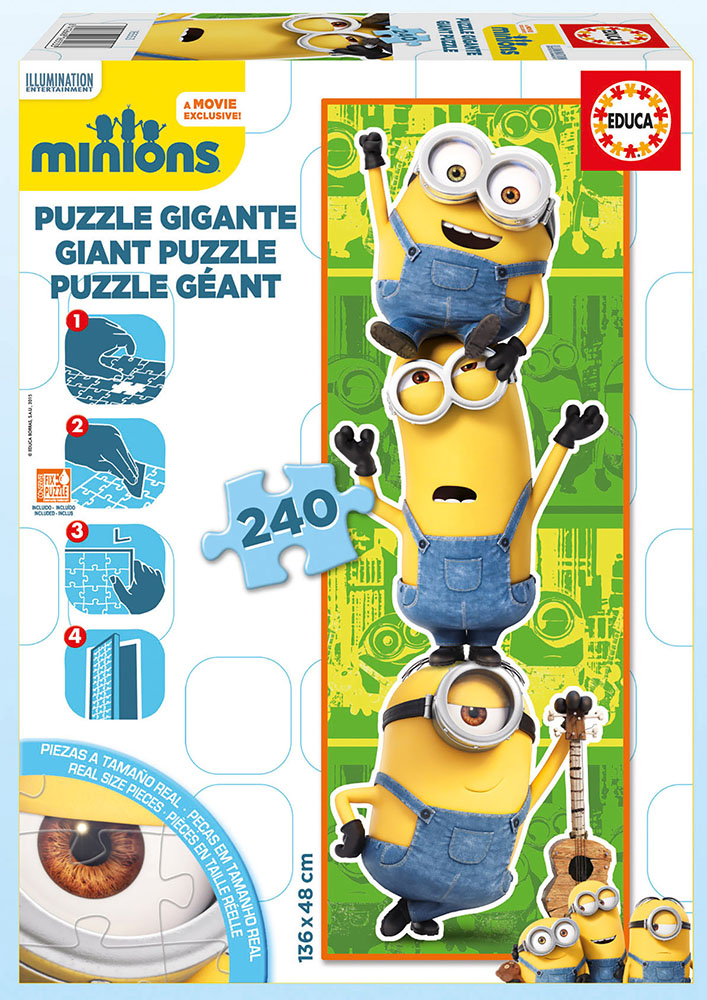 Minionki maxi puzzle 240 elementów to większe elementy, bardziej wygodne dla dziecka w montażu. Obrazy w intensywnych, atrakcyjnych kolorach i połysku bardziej przyciągają wzrok. Atrakcyjne i głębsze pudełko w atrakcyjnym wzornictwie. Wymiary zmontowanej układanki: 100 x 70 cm.