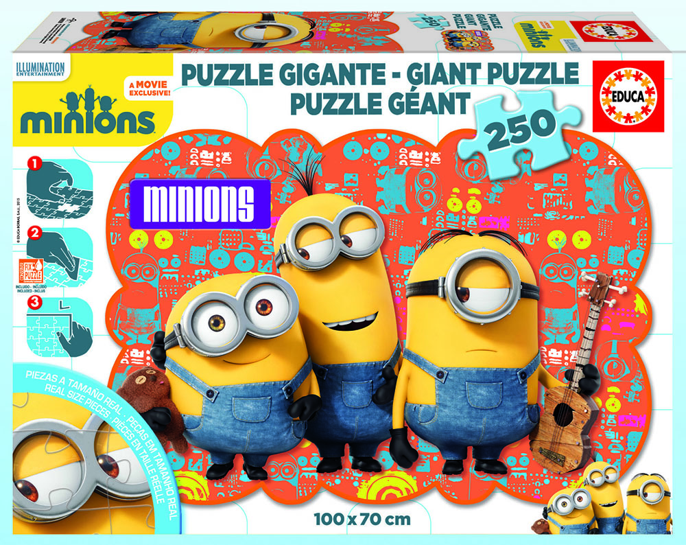 Minionki maxi puzzle 250 elementow to większe elementy, bardziej wygodne dla dziecka w montażu. Obrazy w intensywnych, atrakcyjnych kolorach i połysku bardziej przyciągają wzrok. Atrakcyjne i głębsze pudełko w atrakcyjnym wzornictwie. Wymiary zmontowanej układanki: 100 x 70 cm.