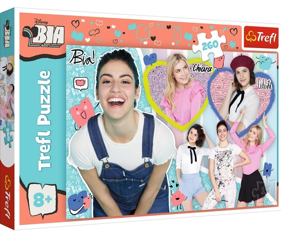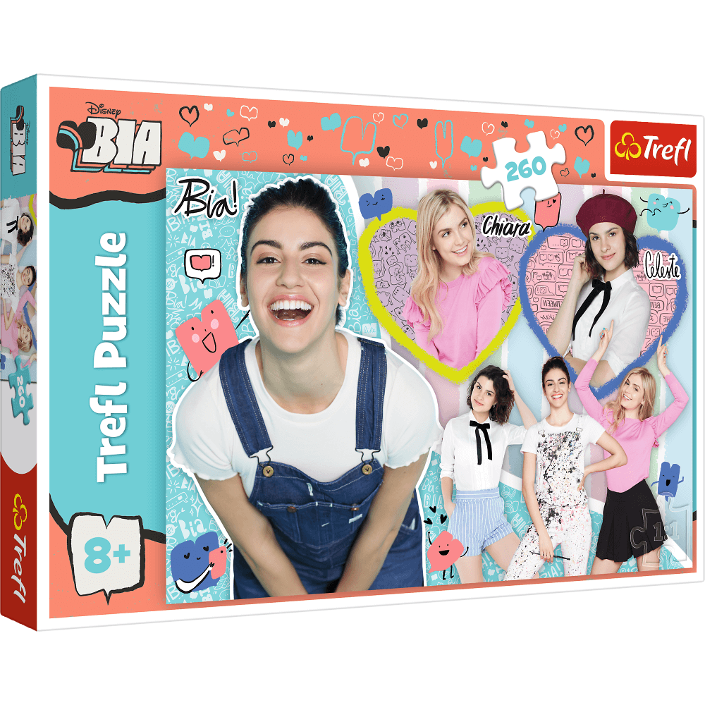 Bia, Chiara i Celeste"" to puzzle 260 elementów z bohaterkami serialu Disneya BIA. Po ułożeniu powstanie obrazek o wymiarach 60x40 cm. Wysoką jakość, nasycenie kolorów i bezpieczeństwo układania zapewnia kalandrowany papier odbijający światło i wykorzystanie materiałów ekologicznych.