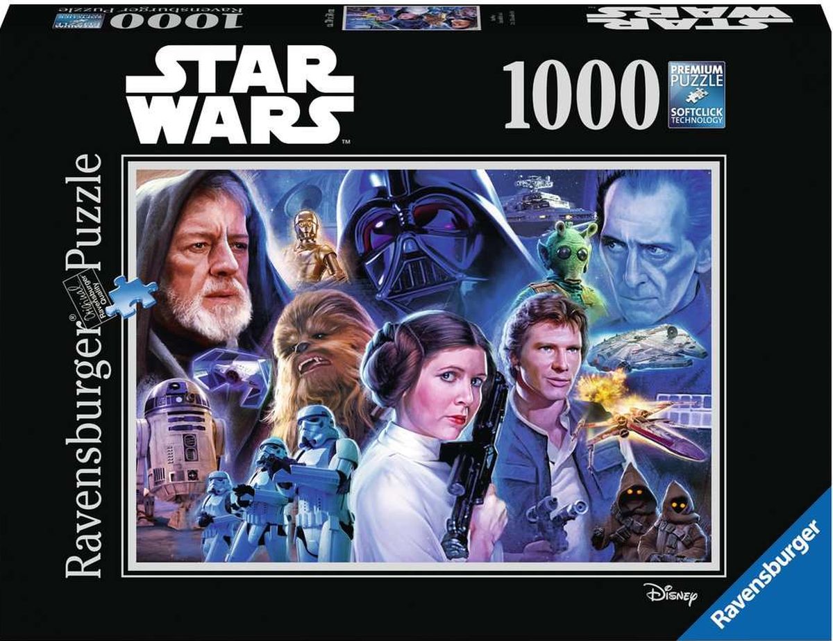 Puzzle 1000 elementów Ravensburger z motywem: Gwiezdne Wojny - Nowa NadziejaPo ułożeniu puzzle mają wymiary 70 x 50 cmSą przeznaczone dla osób powyżej 14. roku życia.