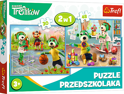 Puzzle Rodzina Treflików. Zestaw zawiera dwa obrazki, składające się z 30 elementów oraz 48 elementów.