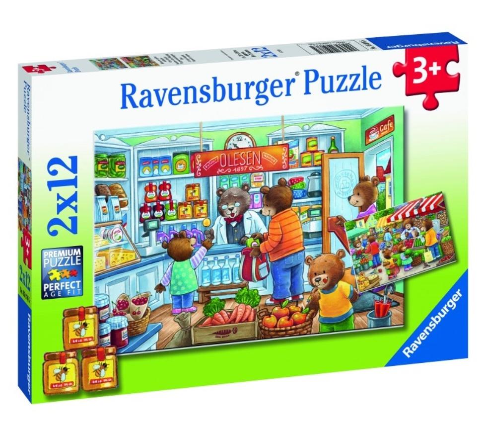 Kolorowe, rysunkowe puzzle Ravensburger przedstawiają scenkę w sklepie.