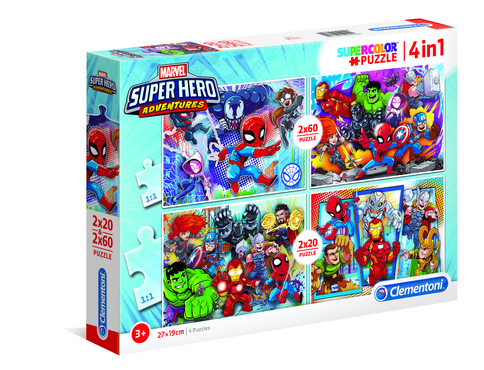 Puzzle SuperColor Clementoni towarzyszą dziecku w każdej fazie jego wzrostu, pomagając mu rozwijać zręczność manualną i zmysł obserwacji. Jakość materiałów i wyjątkowa technika druku gwarantują, że ilustracje bedą zawsze piękne, żywe i błyszczące, a zabawa nigdy się nie znudzi. Do ułożenia bohaterowie Marvela: dwa obrazki po 60 elementów oraz dwa po 20 elementów. Wymiary obrazka po ułożeniu: 27 x 19 cm Wiek 3+