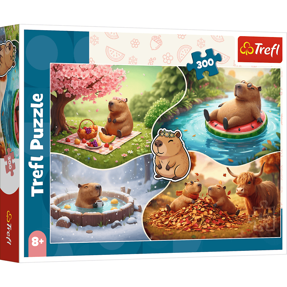 Cztery pory roku z kapibarami to puzzle składające się z 300 elementów przedstawiające urocze kapibary w czterech porach roku, odpoczywające i bawiące się w różnych sceneriach natury. Po ułożeniu układanki powstanie obrazek o wymiarach 600x400 mm.