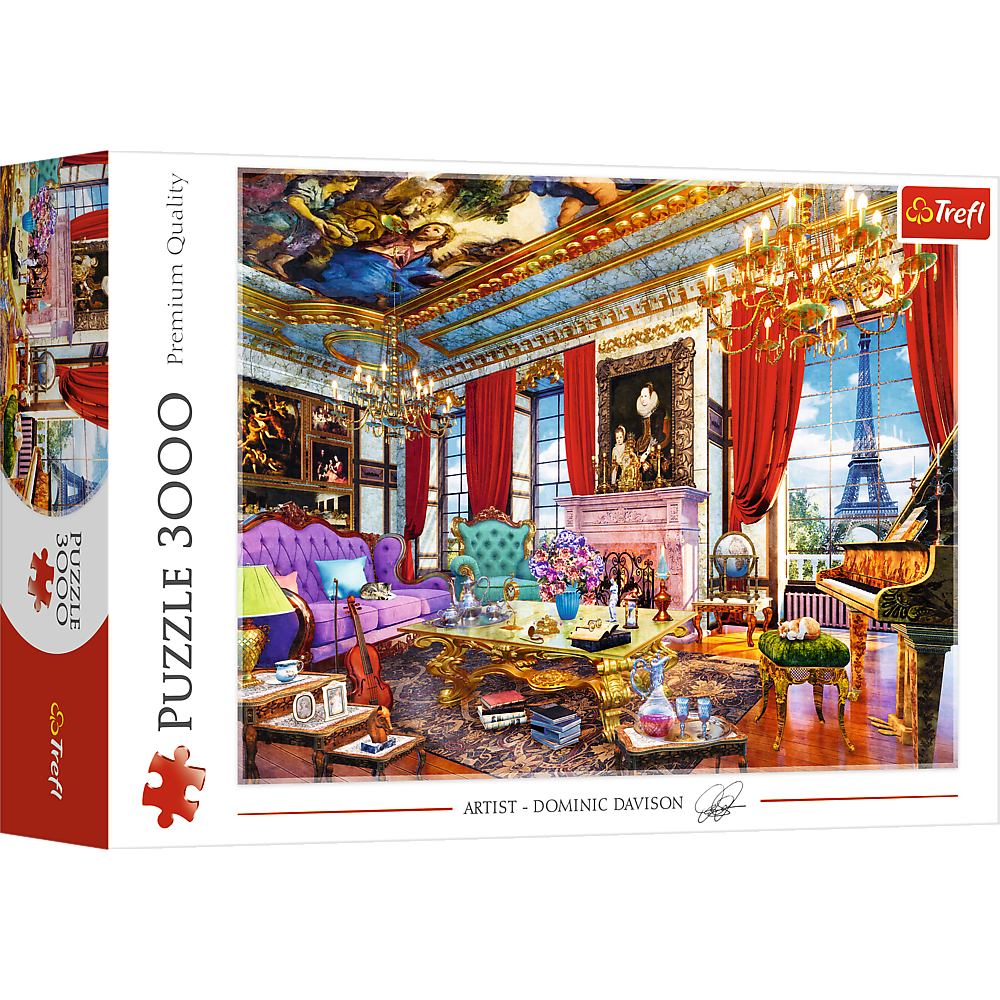 Seria puzzli 3000 elementów jest idealna dla wszystkich miłośników układanek, pozwoli stworzyć obrazek o wymiarach 1160x850 mm. Układanka została wykonana z przyjaznych środowisku materiałów z zastosowaniem papieru niwelującego odbicie światła. Puzzle przedstawiają piękne wnętrza paryskiego pałacu. Autorem grafiki jest Dominic Davison.