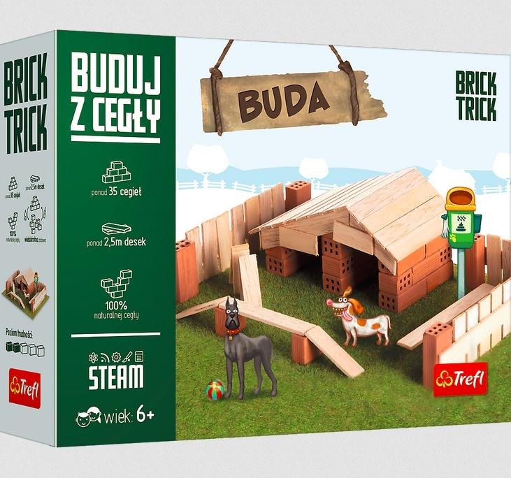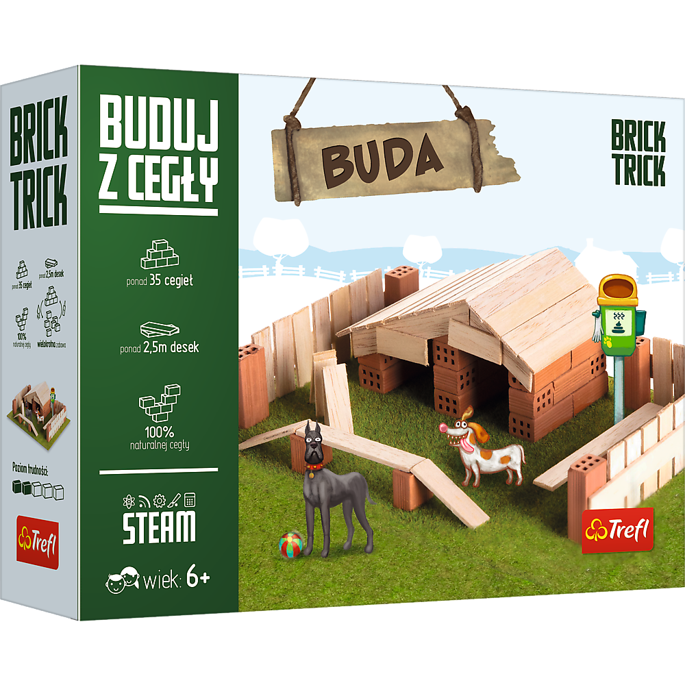 Brick Trick - Zabawa Murowana! Zostań konstruktorem, wykorzystując do budowy prawdziwe cegły i drewno! W instrukcji znajdziesz obszerne ciekawostki prosto z placu budowy. Dowiedz się, jak urozmaicić swoją konstrukcję dzięki wielu interesującym pomysłom i rozwiązaniom. Buduj według instrukcji lub użyj wyobraźni do stworzenia własnej, niepowarzalnej konstrukcji. Możesz też połączyć kilka budynków, tworząc klimat wsi, miasta lub średniowiecza. Wybuduj psią budę, wykorzystując prawdziwe cegły, drewno i elementy dekoracyjne. Skorzystaj z dołączonych planów budowy lub użyj wyobraźni do stworzenia niepowtarzalnej konstrukcji. Baw się dołączonymi pionkami prosto z wiejskiego świata! To nie koniec zabawy! Rozpuść konstrukcję w wodzie i buduj dalej wykorzystując ponownie te same cegły! W zestawie znajdziesz: prawdziwe cegły, klej, drewniane deseczki, elementy dekoracyjne, pionki, podstawkę, naklejkę i instrukcję! Dla dzieci w wieku od 6 lat