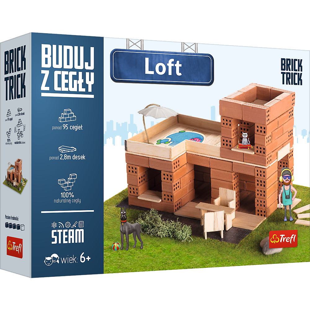 Brick Trick - Zabawa Murowana! Zostań konstruktorem, wykorzystując do budowy prawdziwe cegły i drewno! W instrukcji znajdziesz obszerne ciekawostki prosto z placu budowy. Dowiedz się, jak urozmaicić swoją konstrukcję dzięki wielu interesującym pomysłom i rozwiązaniom. Buduj według instrukcji lub użyj wyobraźni do stworzenia własnej, niepowarzalnej konstrukcji. Możesz też połączyć kilka budynków, tworząc klimat wsi, miasta lub średniowiecza. Wybuduj nowoczesny loft , wykorzystując prawdziwe cegły, drewno i elementy dekoracyjne jak trawa czy krzewy. Skorzystaj z dołączonych planów budowy lub użyj wyobraźni do stworzenia niepowtarzalnej konstrukcji. Baw się dołączonymi pionkami prosto z miejskiego świata! To nie koniec zabawy! Rozpuść konstrukcję w wodzie i buduj dalej wykorzystując ponownie te same cegły! W zestawie znajdziesz: prawdziwe cegły, klej, drewniane deseczki, elementy dekoracyjne, pionki, podstawkę, naklejkę i instrukcję! Dla dzieci w wieku od 6 lat