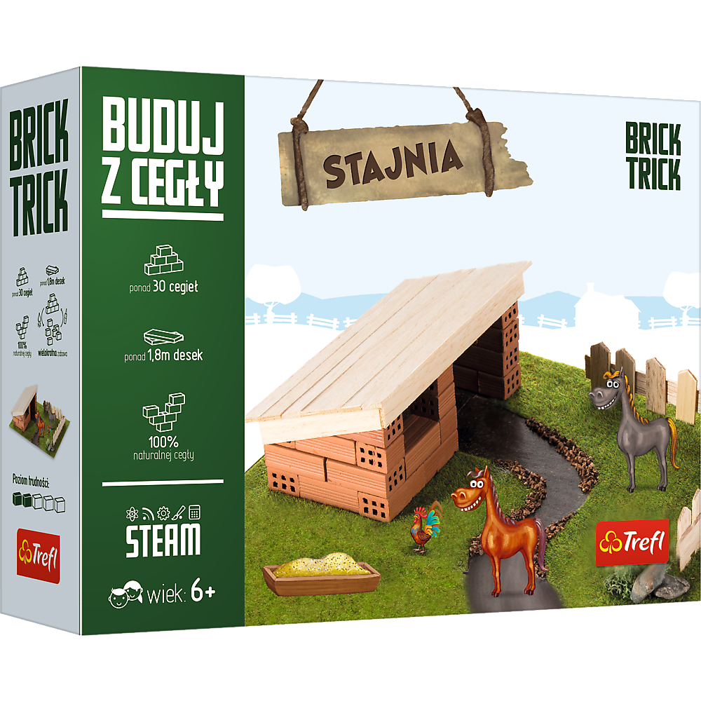 Brick Trick - Zabawa Murowana! Zostań konstruktorem, wykorzystując do budowy prawdziwe cegły i drewno! W instrukcji znajdziesz obszerne ciekawostki prosto z placu budowy. Dowiedz się, jak urozmaicić swoją konstrukcję dzięki wielu interesującym pomysłom i rozwiązaniom. Buduj według instrukcji lub użyj wyobraźni do stworzenia własnej, niepowarzalnej konstrukcji. Możesz też połączyć kilka budynków, tworząc klimat wsi, miasta lub średniowiecza. Wybuduj wspaniałą stajnię, wykorzystując prawdziwe cegły, drewno i elementy dekoracyjne jak trawę, korek czy krzewy. Skorzystaj z dołączonych planów budowy lub użyj wyobraźni do stworzenia niepowtarzalnej konstrukcji. Baw się dołączonymi pionkami prosto z wiejskiego świata! To nie koniec zabawy! Rozpuść konstrukcję w wodzie i buduj dalej wykorzystując ponownie te same cegły! W zestawie znajdziesz: prawdziwe cegły, klej, drewniane deseczki, elementy dekoracyjne, pionki, podstawkę, naklejkę i instrukcję! Dla dzieci w wieku od 6 lat