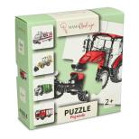 Puzzle Pojazdy zawierają 5 układanek 4-elementowych przedstawiających traktor, śmieciarkę, wóz strażacki, koparkoładowarkę, karetkę.