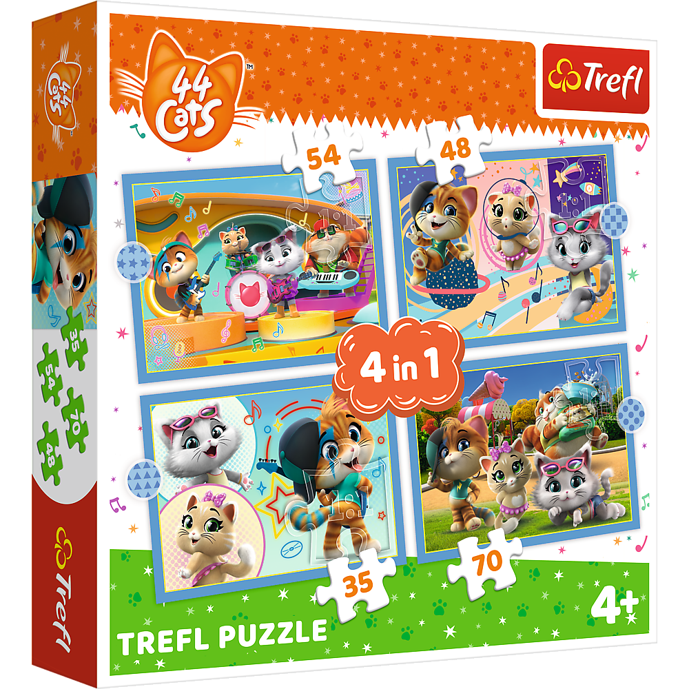 To puzzle dla dzieci składające się z 4 niezależnych układanek, zaprojektowane z myślą o wszystkich fanach i fankach 44 Cats. Po ułożeniu puzzli powstaną cztery obrazki o wymiarach 285 x 200 mm każdy. Zróżnicowana liczba elementów (35, 48, 54, 70) pozwala na zabawę zarówno młodszym, jak i nieco starszym fanom puzzli. Zestaw doskonale spełnia oczekiwania rodzeństwa - każdy ułoży swój ulubiony obrazek nawet w tym samym czasie. Zróżnicowana liczba elementów pozwala na zabawę zarówno młodszym, jak i nieco starszym dzieciom. Do produkcji puzzli użyliśmy materiałów ekologicznych i papieru eliminującego odbijanie światła, co gwarantuje bezpieczeństwo i radość zabawy.