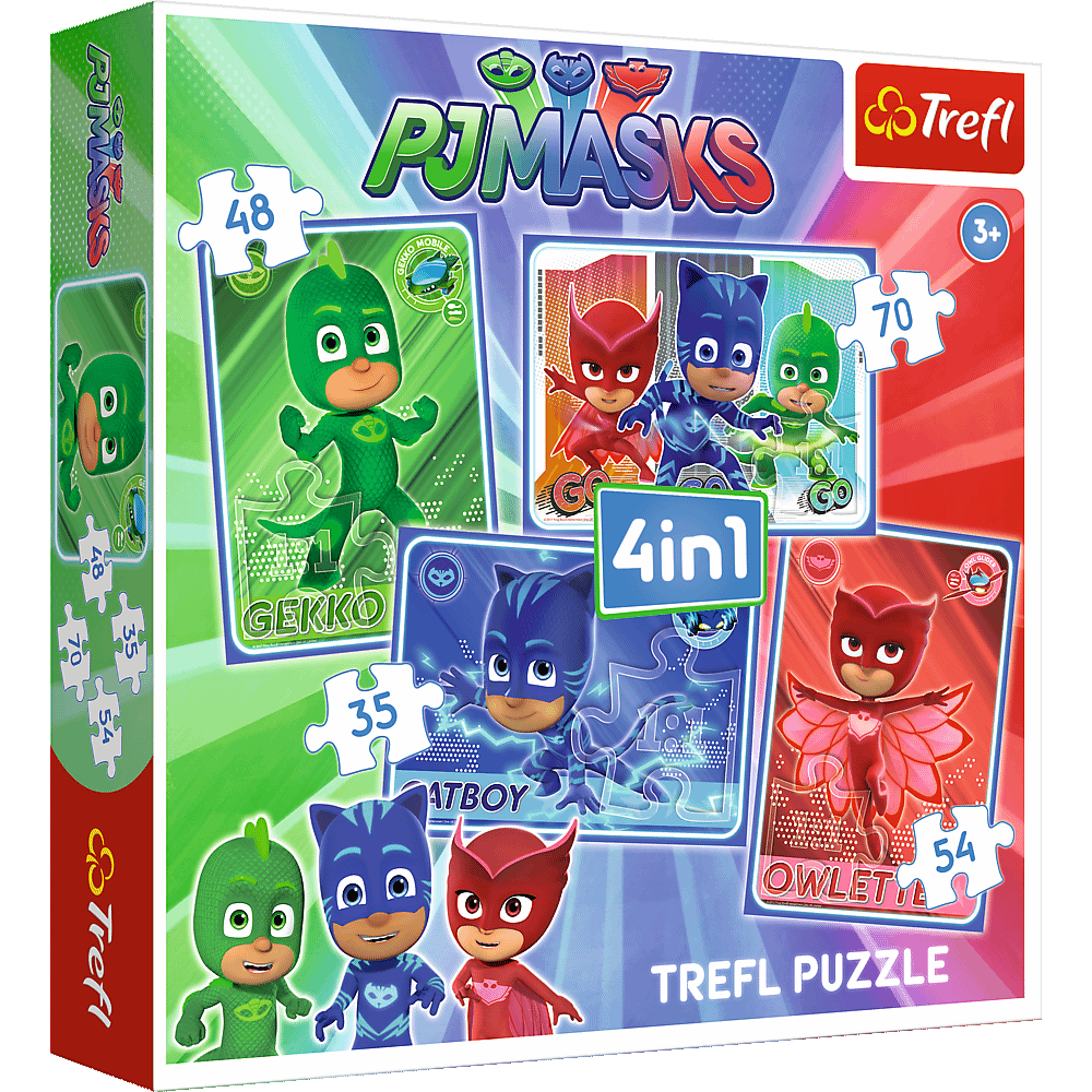 Kotboy i drużyna - Puzzle 4w1 Nie jedna, nie dwie, ale aż cztery układanki umieszczone w jednym pudełku to prawdziwa gratka dla miłośników puzzli! Po ułożeniu otrzymamy cztery obrazki różnej wielkości z bohaterami filmu animowanego "Pidżamersi". Zestaw doskonale spełnia oczekiwania rodzeństwa - każdy ułoży swój ulubiony obrazek nawet w tym samym czasie. Zróżnicowana liczba elementów pozwala na zabawę zarówno młodszym, jak i nieco starszym dzieciom. Dodatkowym urozmaiceniem zabawy może być układanie na czas, porównywanie obrazków, szukanie różnic i podobieństw. Puzzle przyjazne dziecku! Do produkcji puzzli użyliśmy materiałów ekologicznych i płótnowanego papieru eliminującego odbijanie światła, co gwarantuje bezpieczeństwo i radość zabawy. Zawartość pudełka: 1 układanka 70 elementów 1 układanka 54 elementy 1 układanka 48 elementów 1 układanka 35 elementów