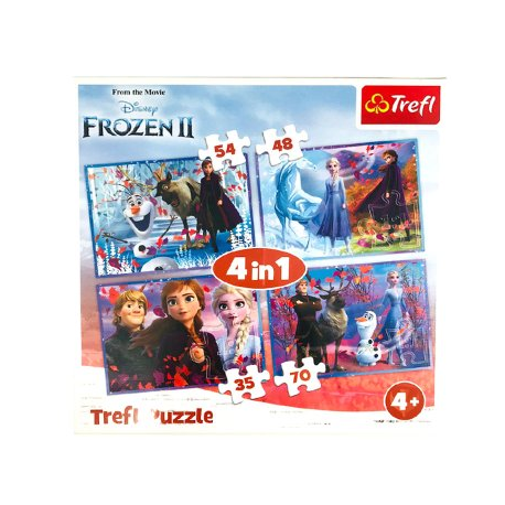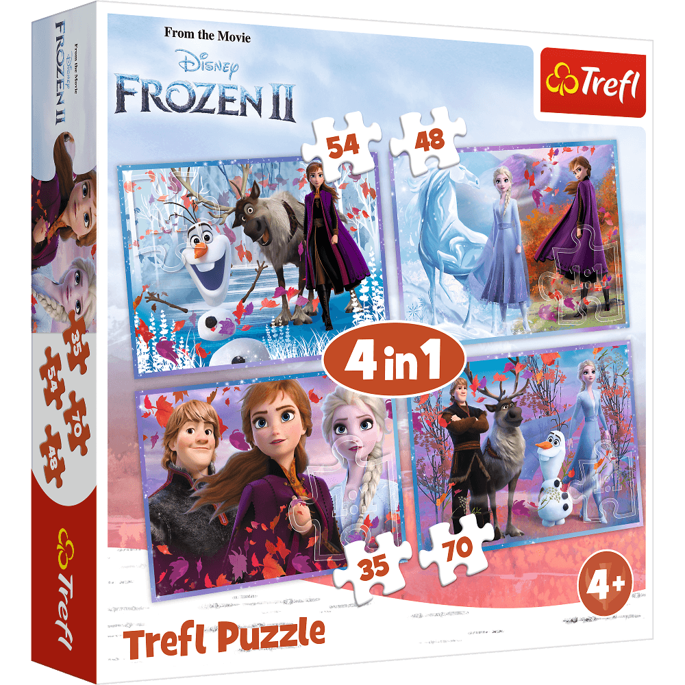 Puzzle składające się z 4 układanek z bajki Kraina Lodu 2. Po ułożeniu układanek powstaną obrazki o wymiarach 285 x 205mm, składające się z: 54, 48, 35 lub 70 elementów. Zróżnicowana liczba elementów pozwala na zabawę zarówno młodszym, jak i nieco starszym dzieciom. Produkt został wykonany z wysokiej jakości materiałów, z zastosowaniem specjalnego kalandrowanego papieru odbijającego światło, co ułatwia układanie. Produkt został wyprodukowany w Polsce, a do produkcji zostały użyte materiały ekologiczne. Wiek: 4+