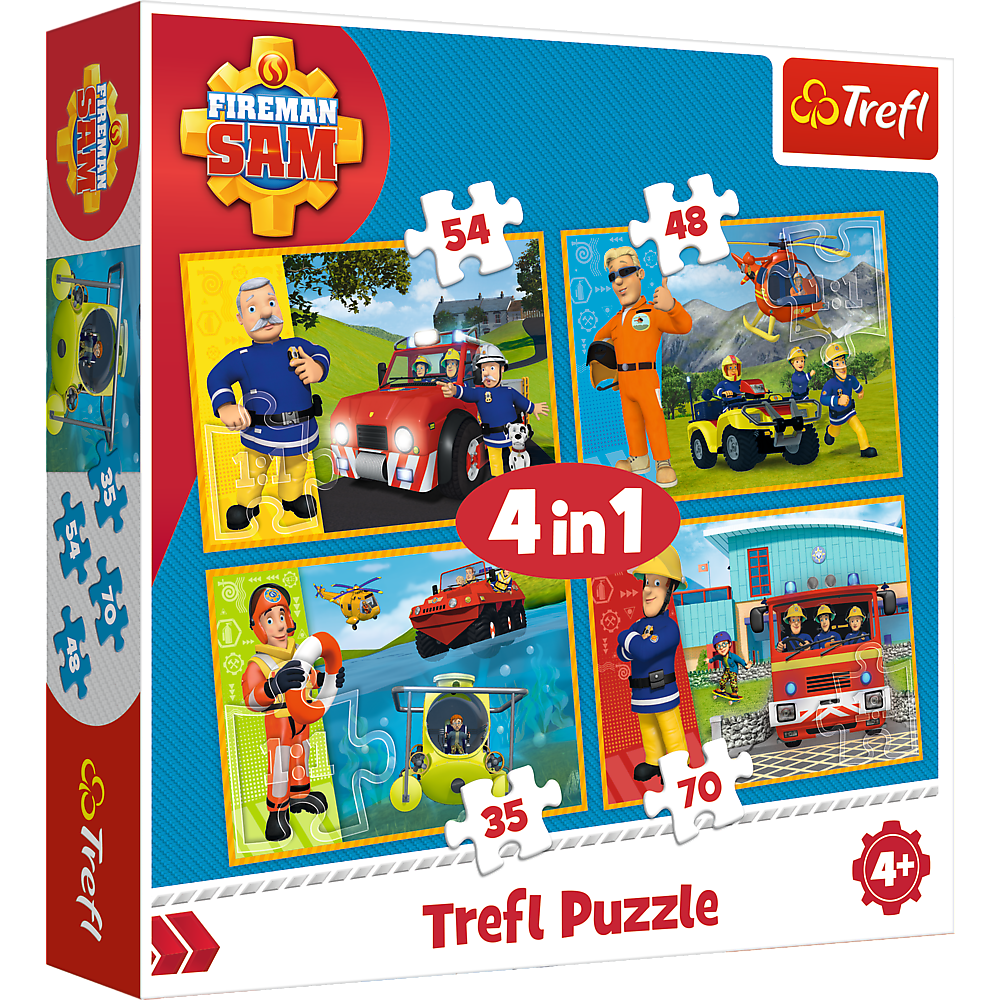 Puzzle 4w1 Strażak Sam na ratunek Do ułożenia cztery obrazki: 35 elementów 48 elementów 54 elementów 70 elementów Wymiary po ułożeniu: 28,5 x 20,5 cm Wiek 3+