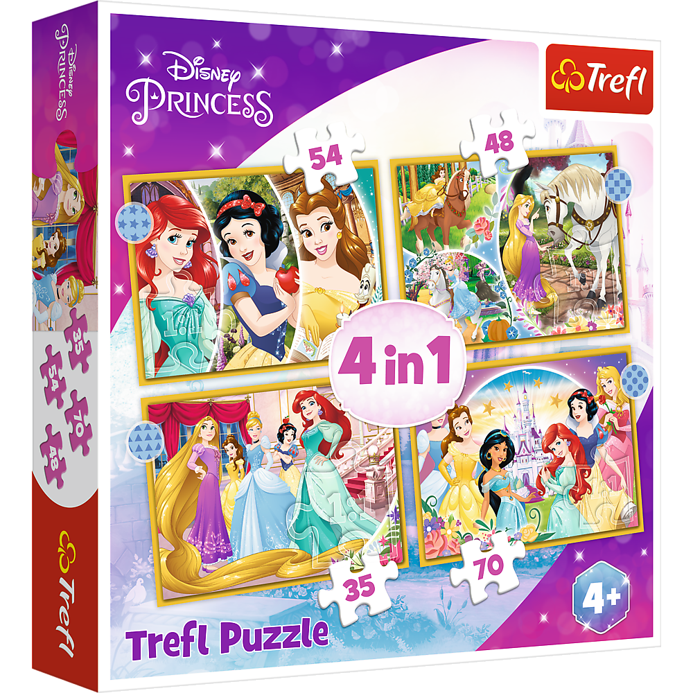 Szczęśliwy dzień to puzzle dla dzieci składające się z 4 niezależnych układanek, zaprojektowane z myślą o wszystkich fanach i fankach Księżniczek Disneya. Po ułożeniu puzzli powstaną cztery obrazki o wymiarach 285 x 205 mm każdy. Zróżnicowana liczba elementów (35,48, 54, 70) pozwala na zabawę zarówno młodszym, jak i nieco starszym fanom puzzli.